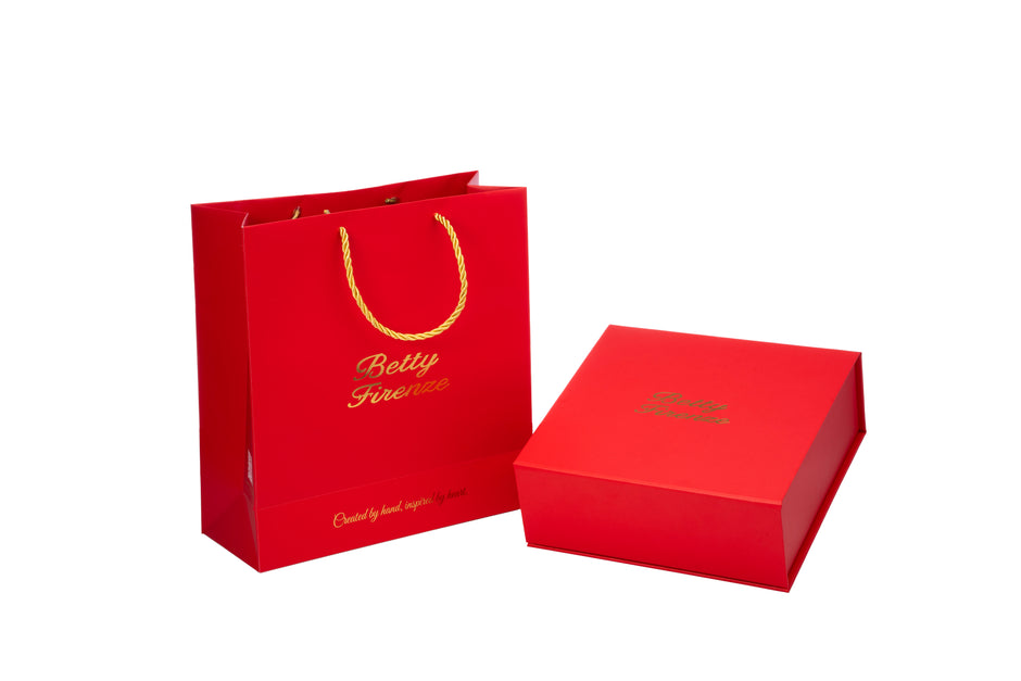 Select Betty Firenze creations are presented in our signature red packaging, finished with gold details and embossed lettering. Designed to reflect the elegance and craftsmanship of the brand, it adds a refined touch to every purchase — perfect for gifting or celebrating something special.