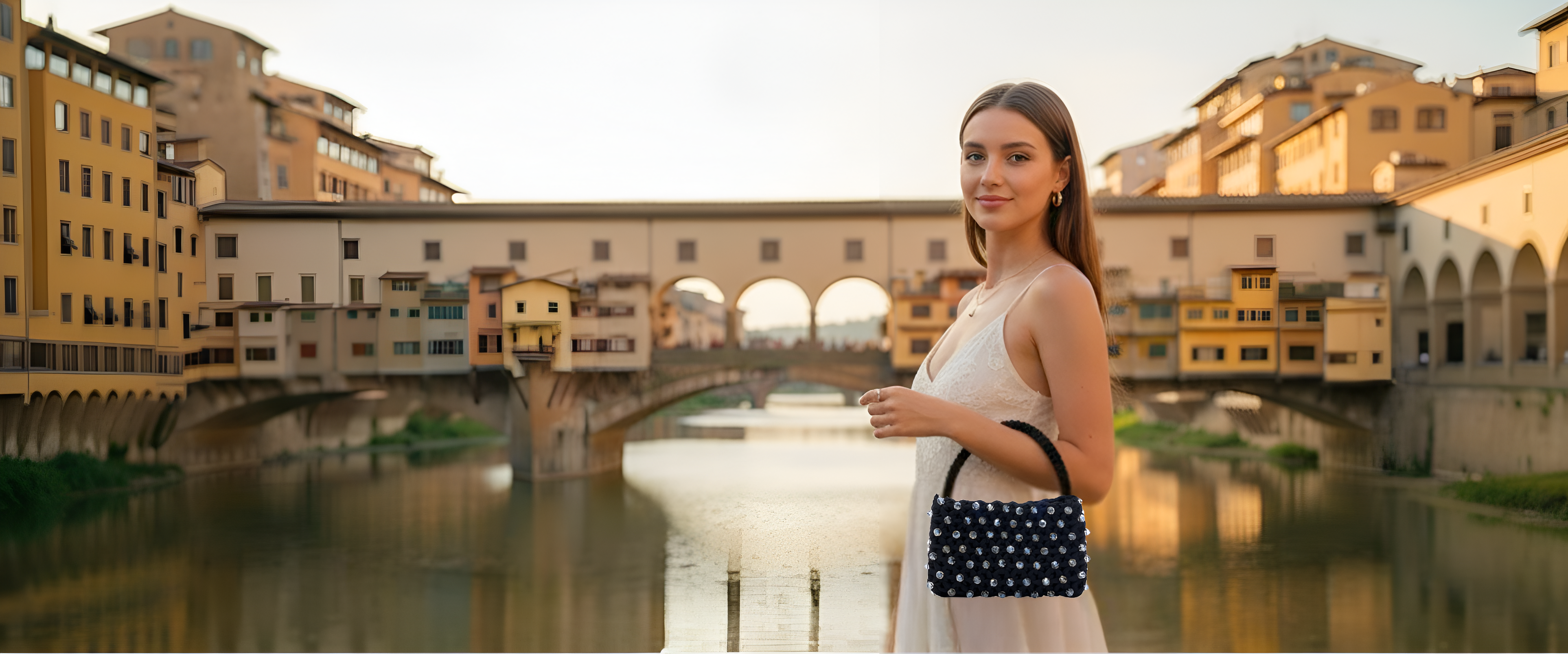 Each bag is handcrafted in Dubai using fine Italian materials, blending the elegance of Florence with the modern light of the Emirates.